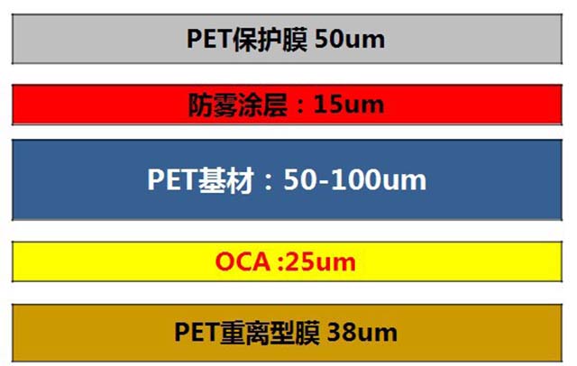 防霧貼膜采用特殊納米涂層材料,由防霧層、PET層、接著層和離型膜依次層迭構成,具有極佳的防霧效果,非常適合使用于冰柜,安全帽,泳鏡,浴鏡,車窗,建筑玻璃等容易起霧的環境。同時,因為本身的親水性特點,亦可使用于汽車后照鏡或車窗,避免下雨時形成水珠阻礙視線。